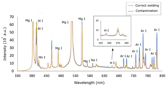 Spectra captured during Weld Trial #9 are shown in Figure 5. In particular, a comparison is shown between a spectrum associated with a section of correct welding and a spectrum from a section where contamination occurred. It can be observed that the contamination gave rise to an increase in the H I line at 656.2 nm (see detail in the inlay), while clear decreases are shown in the intensities of the Ar I lines located between 695 and 811 nm. This behavior agrees with the results provided in Figure 4. It can be observed how some of the emission lines overlapped due to the limited resolution of the low-cost spectrometer chosen. However, this resolution does not compromise a suitable spectroscopic analysis for the required monitoring purposes.