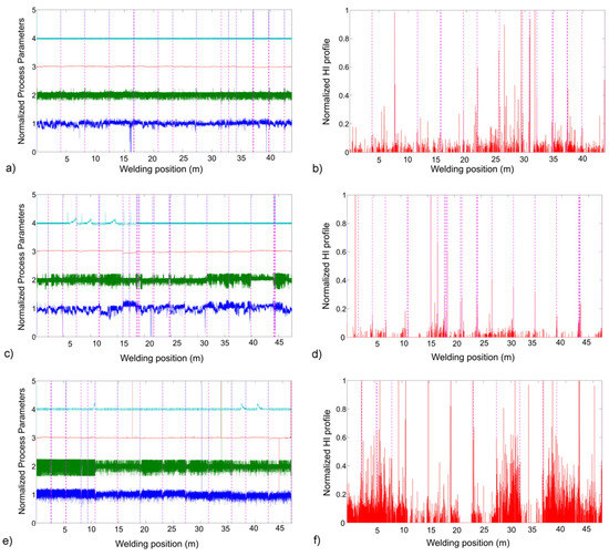 Figure 7 depicts the results derived from the analysis of the seams associated with three different tankers developed on different days. Each tanker is formed by up to 14 different seams, with a total welding length of more than 45 m. The vertical dotted lines in the graphs indicate the separations between different seams, depicted sequentially. Figure 7b,d,f show the corresponding H I profiles which serve as indications of the occurrence of atmospheric contamination or porosities derived therefrom. It can be appreciated that the level of H I participation, calculated as the ratio of the integration of the H I line at 656 nm to an average of the Al lines identified in the spectra, increases from Tanker #2 to #1, and becomes quite significant for Tanker #3. Analysis of the X-ray inspections of these seams revealed a very good correlation, detecting several porosities for Tankers #2 and #3. In fact, an analysis performed a posteriori on the data acquired for the system indicated that the welding for Tanker #3 had been performed with a protection gas flow rate of 16 L/min, inferior to the standard value of around 20 L/min, which explains the high contamination that can be seen in Figure 7f. It is also interesting to point out how in this case (Figure 7e) the electrical parameters, both the welding current and voltage, exhibit a noisier profile in comparison to the rest of the seams. Figure 7a,c,d present the welding voltage (y ≈ 1), current (y ≈ 2), gas flow rate (y ≈ 3) and wire feed speed (y ≈ 4) for these three tankers, with their corresponding values normalised to allow a suitable representation.