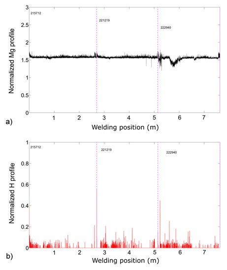 Although the occurrence of defects apart from porosities is low, Figure 8 presents an example of a crack detected via X-ray in Seam #222940 (Tanker #2). As already discussed, while H profiles are suitable to detect the appearance of porosities, other defects might not be reflected in them. In this example, the level of H participation is quite similar in these seams, but there is no clear indication of the mentioned crack. The Mg profile, calculated as the ratio of the integrated value of the Mg I line at 553 nm to an average of the detected Mg lines, shows a clear dip associated with the location of the crack detected by means of the X-ray inspection.