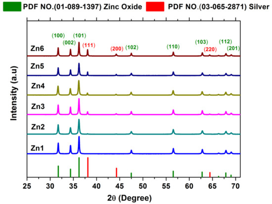 XRD patterns for the different silver concentrations of the nanocomposites (Zn1, Zn2, Zn3, Zn4, Zn5, and Zn6).