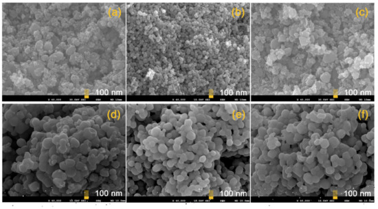SEM images of ZnO/Ag nanocomposites: (a) Zn1, (b) Zn2, (c) Zn3, (d) Zn4, (e) Zn5, and (f) Zn6.