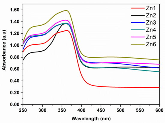 The absorption properties of ZnO/Ag nanocomposites were investigated with UV-Vis spectroscopy in the 200–650 nm range of wavelengths. Figure 4 shows the absorption spectra for Ag nanoparticles on ZnO with different atomic contents of Ag. All the samples show strong absorption in the UV range. Additionally, the broad exciton-related peak at 360–370 nm disappears, and this behavior is associated with UV absorption in zinc oxide [27]. The absorption spectrum of pure ZnO shows maximum absorption at 360 nm. Furthermore, with the Zn2 sample, the absorption edge shifted to a higher wavelength (365 nm) with respect to pure ZnO (Zn1). This shift is related to the incorporation of Ag NPs in the ZnO matrix [28].