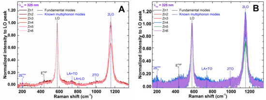 Spectra measured under the 325 nm excitation wavelength are presented in Figure 5, which shows the typical spectra of ZnO compounds under the resonant conditions, with an intense LO peak (sum of two modes with A1 (LO) and E1 (LO) symmetry) and its second-order 2LO peak [29]. In the average spectra of each sample, additional small intensity peaks can be identified (see the vertical dashed lines in Figure 6). All of them are related to the fundamental or previously observed multiphonon modes of the ZnO compound [30]. No additional peaks/bands that can be associated with the presence of Ag NPs in the powders can be observed in the spectra that were measured.