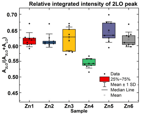 Furthermore, the homogeneity of the samples and possible correlation of the Ag atomic percentage with the intensity of additional peaks/bands were accomplished. For this different reference, the LO peak in the spectra was selected, measured under 325 nm excitation. This peak is separated from the additional bands and makes it possible to define the homogeneity or correlate the spectra evolution with the Ag content. The homogeneity of the powders was assessed by calculating the relative integrated intensity of the 2LO peak in the spectra measured under 325 nm excitation. The ratio of intensities between the 2LO and LO peaks mainly changes due to the band gap variation in the ZnO compound, which changes the proximity to the resonant conditions [31,32]. As seen from the box plot in the left panel of Figure 6, the mean value of the relative integrated intensity of the 2LO peak is quite similar in all the samples, except for sample Zn4. Also, the homogeneity of the samples is different and is can be seen to be quite good for Zn2, with Zn3 being the worst. No correlation of the mean value or the inhomogeneity of the sample with the amount of Ag concentration was observed, assuming a gradual increase in the Ag NPs in the nanocomposites from sample Zn1 to sample Zn6.