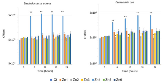 Results of the effect of the treatments on S. aureus and E. coli in the absence of treatment (Ct), with ZnO (Zn1) and with the ZnO/Ag nanocomposites (Zn2, Zn3, Zn4, Zn5, and Zn6). The bars on the graphs represent the standard error; the asterisks indicate significant differences.