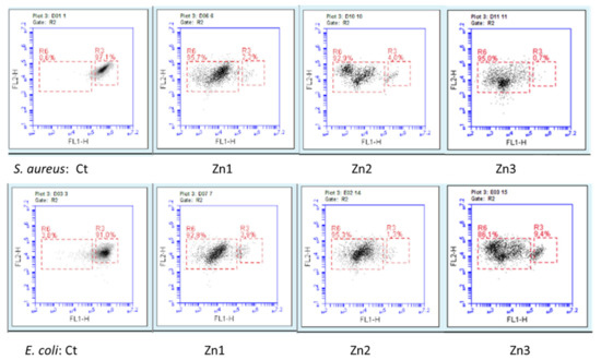 In order to check whether the effect of the Zn/Ag nanocomposites was bacteriostatic or bactericidal, the samples were stained with the LIVE/DEAD BacLight kit and further analyzed through flow cytometry. All treatments showed a bactericidal effect when compared to controls, as seen in Figure 8. The treatments reduced the percentage of living cells by more than 90% in most cases. Table 1 shows the results of the percentages of live bacteria concerning the total number of cells counted, which were obtained using the flow cytometer after being stained with the live/dead kit.