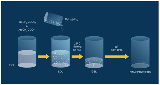 The first step of sol-gel synthesis is based on dissolving the two metallic precursors in 20 mL of ethanol (EtOH, Scharlau, Sentmenat, Spain) using a magnetic stirrer at room temperature (25 °C). After preparation, triethanolamine (C6H15NO3, Acros Organics, Spain, Barcelona, 99%) was added to the solution as a reducing/precipitation agent. After approximately 30 min stirring at room temperature, a dense white gel was formed. We let it dry for 30 min at room temperature before the gel was calcined at 600 °C for 1 h in a muffle furnace to obtain white-colored nanopowders as the final product (Scheme 1).