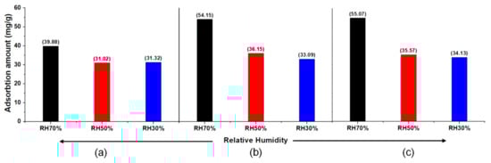 The authors of the present manuscript have attempted to improve the adsorption performance of bead-type AC (BAC) and two acid-modified BACs (sulfuric acid-modified BAC (SA-BAC) and hydrochloric acid-modified BAC (HA-BAC)) at different RH values. The results are shown in Figure 1. The adsorption data (mg-FA/g-AC) showed a similar trend in all three cases: a higher capacity at a higher RH (70%) and a lower capacity at a lower RH (30%). FA adsorption clearly improved at RH 70% in all three cases. Notably, both SA-BAC and HA-BAC showed a greater improvement in FA adsorption capacities than BAC at RH 70% (Figure 1). These results support the claim that the absorption of FA into the adsorbed water on the pore surface may be enhanced when surface modifications are applied.