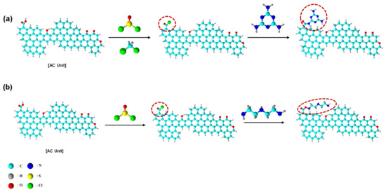 Grafting reactions (a) between melamine and activated carbon and (b) between diethylene triamine and activated carbon via halogenated intermediates for both cases.