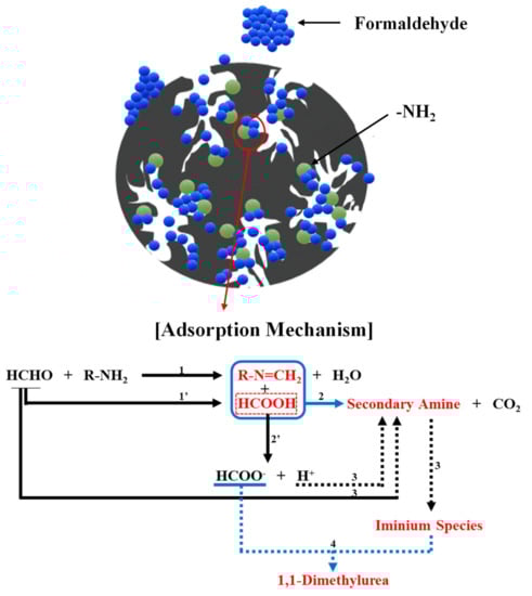 The mechanism of FA is described in our previous report [63]. Considering urea as an amine source, the carbonyl group of FA adsorbs onto the active sites (micro-walls) of AC (HCHO(g) → HCHO(ad.)), in which the adsorbed FA, presenting δ+, nucleophilically reacts with the amine group to form an imine (HCHO(ad.) + R-NH2 → R-N=CH2 + H2O). In parallel, adsorbed FA can be oxidized to produce formic acid (HCHO(ad.) + 1/2O2 → HCOOH(ad.)). Formic acid reacts with imine to produce a secondary amine (HCOOH(ad.) + R-N=CH2 → R-NHCH3 + CO2). Meanwhile, the absorbed formic acid can be dissociated to H+ and HCOO−, where H+ may react with the secondary amine and the adsorbed FA to produce iminium species (H+ + HCHO(ad.) + R-NHCH3 → R-N+CH3CH2 + H2O). Subsequently, the reaction of the iminium species and HCOO− leads to the formation of 1,1-dimethylurea (R-N+CH3CH2 + HCOO− → R-N(CH3)2 + CO2). The concept of the mechanism of FA removal through amination of AC is illustrated in Figure 4.