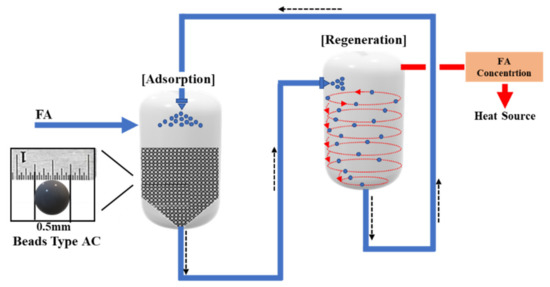 Formaldehyde is a highly toxic indoor pollutant that poses a grave threat to human health. Various technologies have been intensively evaluated for the effective removal of formaldehyde from indoor air. AC has a relatively high adsorption affinity, owing to its high surface area. The diverse commercialization of activated carbon (AC) has motivated a review of current technologies for formaldehyde removal in terms of AC surface modification. Among these modifications, amination is widely used to remove low concentrations of formaldehyde. In the literature, aminations are often achieved by impregnation and/or grafting of amine functional groups onto the AC surface. The amine functional groups participated in the adsorption of formaldehyde. In the case of grafting, the amine functional group reacts to form chemical bonds with intrinsic functional groups on the AC surface. Herein, the carboxyl group, as a representative functional group on the surface of AC, was used to demonstrate amination reactions with various amine chemicals. When considering the commercial application of AC, the outcome of toxic chemicals must be considered. In particular, amination reactions are induced by toxic amine compounds. Therefore, less toxic amine sources are necessary and are recommended. We classified amine sources based on toxicity/nontoxicity (Table 5). Moreover, the application of AC in industry has always been limited by safe working environments. Representative issues include dust (explosion) and handling feasibility. To overcome these problems, new types of AC are required. For example, AC with higher compressive strength and fluidity is recommended. In this regard, the present authors developed a new bead-type (spherical) AC with a high surface area (exceeding 1500 m2/g), high compressive strength (9 kgf/unit), and fluidity with a mean particle size of less than 1 mm. AC with these physical properties is expected to be a safer alternative to conventional AC. In particular, the application of this bead-type AC will benefit industries with high FA emissions, such as the wood (furniture) processing industry. In addition, it can be effectively used as the purifier of an indoor environment, with processability owing to the fluidity of the bead-type AC. This type of AC can be easily operated for adsorption and desorption, thereby making it feasible for recycling (Figure 5). More details regarding customized BAC are still in the evaluation stage and will be provided in future studies.