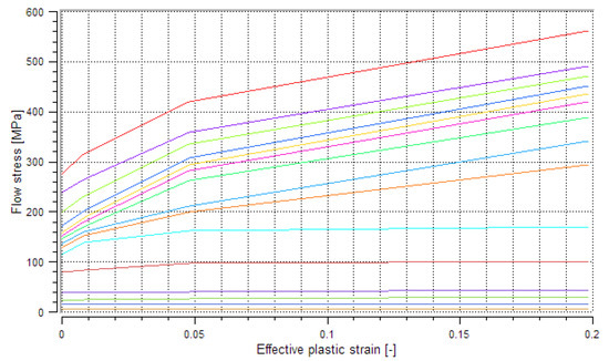 Modelling of thermo-mechanical behaviour is a significant part of the numerical analysis of the DED process. DED simulation has been performed supposing a welding approach. It is carried out on Simufact Welding Software as it provides possibilities to model heat treatment processes, variations of cooling and unclamping setups, as well as mechanical loading of welded structures. Additionally, it has a capability to define residual stresses and map thermal process effects on the part using flow curves of materials. 316L material is described as DED material with its chemical composition in Table 1 and its flow curves (see Figure 2) from software material database.