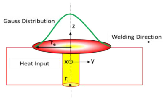 The heat source is described in the numerical model as a volume and surface distributed heat source, which consists of a Gauss surface distribution of the heat input and a constant heat distribution cylinder. An illustration of the described heat source model can be seen in Figure 3.