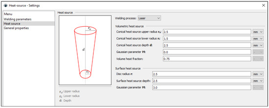 where is the process efficiency, is the power in (W), and is the focus radius [28]. A DED simulation model has been performed based on the experimental laser parameters. Heat source parameters used in the analysis are displayed in Figure 4.