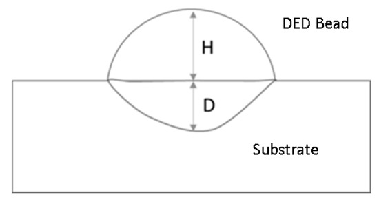Dilution is one of the most critical parameters for DED process performance. It is a dimensional parameter and is defined by the ratio between the melt pool penetration depth below the substrate and the sum of melt pool penetration depth and deposited height for a single track. It is calculated as shown in Equation (3);