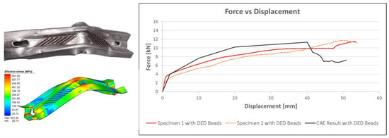 Finally, the hybrid product has been subjected to an imposed displacement using a mechanical durability test system physically and evaluated on the same software mapping the DED process results onto the part, as shown in Figure 12.