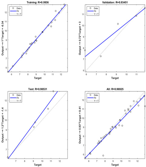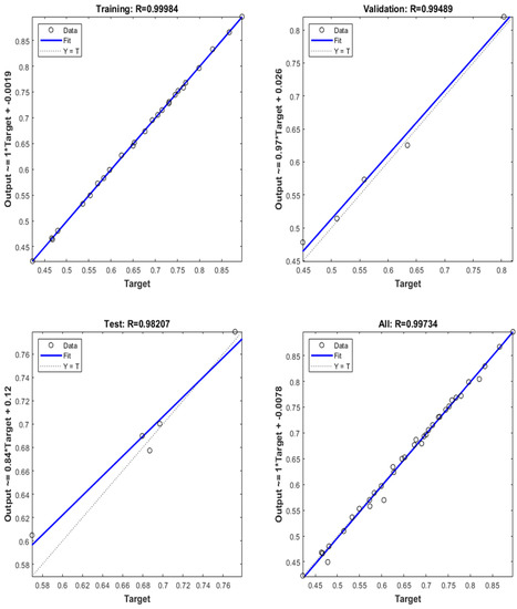 A hold-out technique for cross-validation is used by partitioning the data into two segments, which are the data used for the validation test and the other for training the neural network model [31,32]. This technique is preferred as the data set is small, at almost 30 data. In total, 70%, 15%, and 15% of data points are used for training, testing, and validation, respectively. In order to find the optimum ANN structure, a nested loop is designed using the learning rate, number of neurons, and different training functions. The ANN model and predictions are saved when the Pearson correlation coefficient (R) of the test is higher than 0.965, as well as finding better MSE values throughout the cycle. The reason for choosing MSE besides the R-value is to prevent over-fitting and increase accuracy. Thus, in this study, the hold-out technique is employed to evaluate the learning algorithm of the present neural network model. The present neural network model offers an ANN model with higher prediction ability. The pseudocode of the optimum ANN model is presented in Algorithm 1.