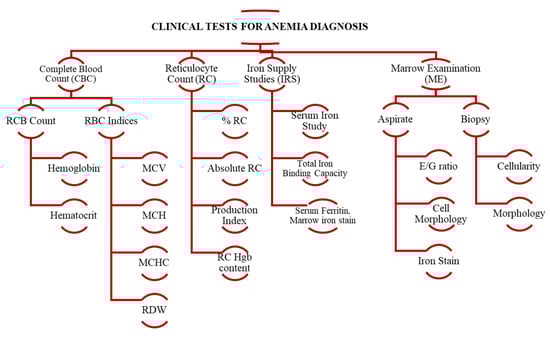 Changes in the size of RBC elements is the alarming condition for reducing hemoglobin quantity in blood. The normal range of RBC size is 80 to 100 femtolitre/RBC (fl/RBC). RBC’s normal diameter and thickness range from 6.2 to 8.2 µm and 2 to 2.5 µm, respectively []. Macrocytosis (size of RBCs greater than normal reference range) and microcytosis (size of RBCs less than normal reference range) defects depend on the size of RBCs. The reference size of RBCs is expressed by an index called mean corpuscular volume (MCV). The normal size of healthy RBCs in terms of MCV is 80 to 100 fl []. RBCs with MCV levels below 80 fl cause MHA anemia, while MCV levels above 100 fl cause macrocytic anemia []. Anemic patients can be classified into three categories: severe (with hemoglobin <7.0 g/dL), moderate (with hemoglobin <7.0–8.9 g/dL), and mild (with hemoglobin <9.0–10.9 g/dL), based on WHO classification []. The hypochromic condition is also initiated due to the varying hemoglobin concentration in the blood. The hypochromic concentration is indicated by mean corpuscular hemoglobin concentration (MCHC). The reduced MCHC causes hypochromatism in single RBCs from the normal range, i.e., MCHC < 32 [,,]. Many laboratory tests were carried out for the identification of anemia. Some of the tests are listed in Figure 1.