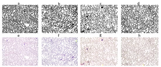 Images from (a,b) represent healthy binary RBCs images, (c,d) images are binary representations of Anemic-RBCs, images from (e–h) represent pixel-level healthy and Anemic-RBCs images.