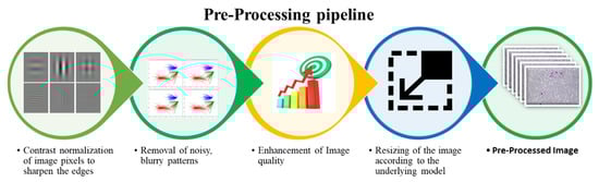 In CNN-based deep learning models, pre-processing is the key step to re-arranging the data for better execution. Unwanted features and the noise in the blood images were removed during this step to prepare them for further processing. Pre-processing involves the following steps, as shown in Figure 5.