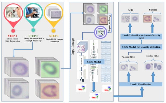 After the ethical committee's approval of SKMCH&RC, we collected real-time microscopic images of a peripheral blood smear. These images were used to train and test the proposed CNN-based model to diagnose anemia and its severity level from a digital image like an expert medical consultant. Before the training and testing process, collected images were annotated and manually classified into relevant classes under the supervision of a medical consultant, as shown in Figure 3 and Figure 4. The methodology section comprises the following steps.