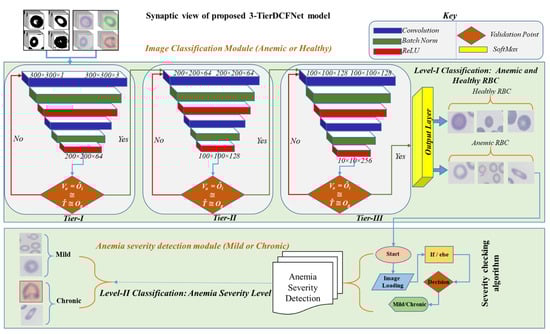 Furthermore, tier-I ensures the pixel-level analysis of the inputted image. Tier-II preserves the semantic information of the RBC element to classify relevant classes and detect severity levels, while tier-III maintains comparable accuracy with less computational resources. To evaluate the proposed model, training, validation, and test accuracies were calculated along with recall, F1-Score, and specificity. The global results reveal that the proposed model accomplished 91.37%, 88.85%, and 86.06% training, validation, and test accuracies with 98.95%, 98.12%, and 98.12% recall F1-Score and specificity, respectively.