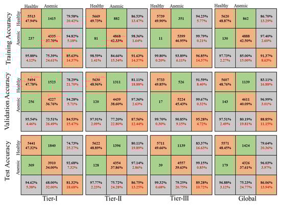 The tier-I of the proposed model achieves 85.63%, 84.53%, and 81.32% accuracies for training, validation, and test set, respectively. In contrast, tier-II achieved 91.63%, 87.57%, and 86.75% accuracy, respectively. However, Tier-III outperforms Tier-I and Tier-II and achieved 96.85%, 95.28%, and 89.29% accuracy for training, validation, and test set, respectively. Globally, the proposed model achieved 91.37%, 88.85%, and 86.06% accuracy. The confusion matrix of training, validation, and testing accuracies of Module-I classification is given in Figure 9.
