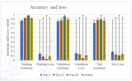 Recall of the proposed model was 93.49%, 95.98%, 95.87%, and 98.12% for Tier-I, Tier-II, Tier-III, and global, respectively, as shown in Table 4.