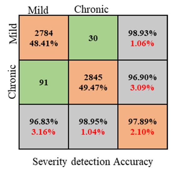 Generally, accuracy gives the recognition rate of the classifier. It is defined as the ratio between the sum of true positive (TP) and true negative (TP) values over the sum of TP, TN, false positive (FP), and false-negative (FN) values. The mathematical expression for accuracy is shown in Equation (3):
