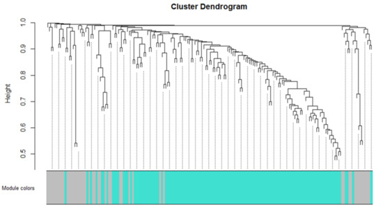 Hierarchical cluster dendrogram and gene module identified by weighted correlation network analysis (WGCNA). Gray genes are not included in any module.