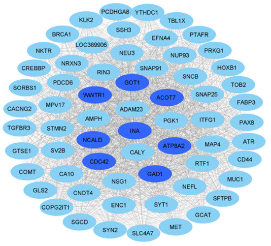 Then, we used Cytoscape to visualize the module obtained with WGCNA, obtaining a network of 64 genes and 1760 edges. ACOT7, ATP8A2, CDC42, GAD1, GOT1, INA, NCALD, and WWTR1 were the genes with the highest degree centrality. Figure 4 shows the co-expression network.