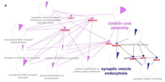 The MCODE plugin of Cytoscape was used to identify interconnected regions of the network identified with STRING and we obtained a cluster of 12 genes (AMPH, CA10, CALY, NEFL, SNAP25, SNAP91, SNCB, STMN2, SV2B, SYN2, SYT1, and SYT13) and 42 edges (Figure 7).