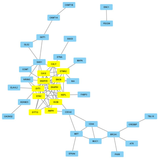 We further investigated the protein functional network that involves the 76 consensus DEGs. We found a network of 39 interacting proteins consisting of 81 interactions. Among them, MCODE identified AMPH, CA10, CALY, NEFL, SNAP25, SNAP91, SNCB, STMN2, SV2B, SYN2, SYT1, and SYT13 as a cluster of interconnected genes. AMPH, CA10, CALY, NEFL, SNAP25, SNAP91, SNCB, STMN2, SV2B, SYN2, and SYT1 are common genes between the WGCNA module and the 12 genes found with MCODE.
