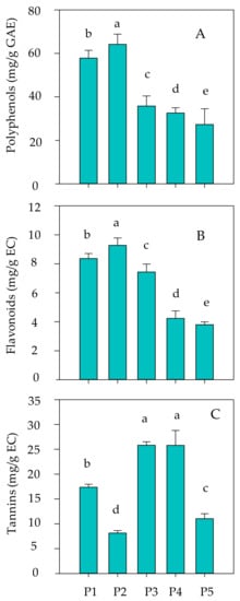 Total phenols (mg GAE/gDW; (A)), flavonoids (mg CE/gDW; (B)) and tannins (mg CE/gDW; (C)) content in P1 (Pistacia lentiscus), P2 (Rosmarinus officinalis), P3 (Erica multiflora), P4 (Calicotome villosa) and P5 (Phillyrea latifolia) ethanolic extracts. Means of three replicates are reported (±SD). Significant differences are detected in the bars (p < 0.05), Duncan’s test. The letters (a–e) denote significant (p < 0.05) difference between means.