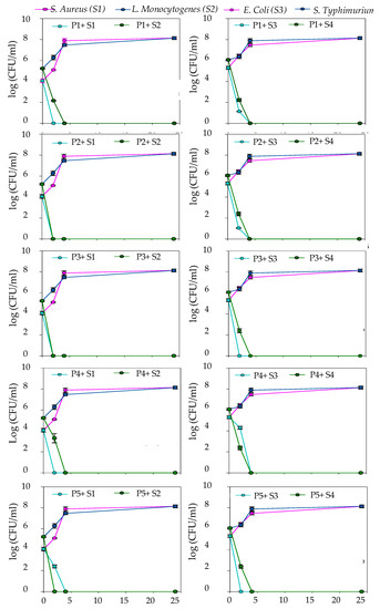 Time-kill curves of Gram-negative in the left (Escherichia coli (S2) and Salmonella typhimurium (S4)) and Gram-positive in the right (Listeria monocytogenes (S2) and Staphylococcus aureus (S1)) in control suspensions and the MICs of P1 (Pistacia lentiscus), P2 (Rosmarinus officinalis), P3 (Erica multiflora), P4 (Calicotome villosa) and P5 (Phillyrea latifolia) ethanolic extracts. The mean of the standard deviations for three replicates is indicated by symbols. The lower detection threshold was 0 CFU/mL.