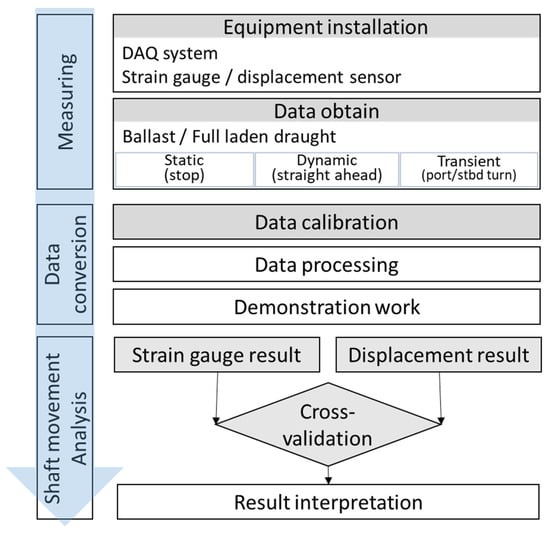 Figure 1 schematically shows the research approach used in this study. First, the data acquisition (DAQ) system and sensors were configured to collect information on the ship’s propulsion system, and the target data were collected by operating the ship according to the established trial plan. In addition, data conversion and analysis were performed. The results of this study are discussed through cross-validation between the sensors.
