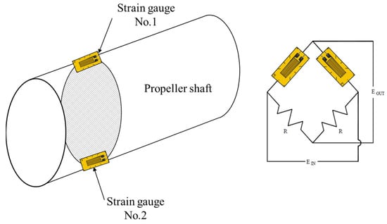 The Wheatstone bridge circuit method is a common method that is applied for measurement using a strain gauge. There are 3 types of strain gauge configuration based on the number of active gauges: quarter-bridge (1 active gauge); half-bridge (2 active gauges); and full-bridge (4 active gauges). In general, the half-bridge configuration for bending moment measurement has all the advantages of the full-bridge configuration. The full-bridge configuration creates an output voltage that is double that of the half-bridge configuration, but it was not necessary for the measurements in this study. Therefore, as shown in Figure 3, a half-bridge strain gauge circuit was applied in consideration of the high accuracy compared with the installation time.
