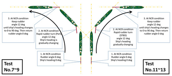 Therefore, as given in Table 3 and Figure 7, the measurement was made by going straight ahead (at a 0° rudder angle) and then turning rapidly (at a 12° rudder angle) until the head of the ship changed by 90°, and then the ship went back to going straight ahead (at a 0° rudder angle).