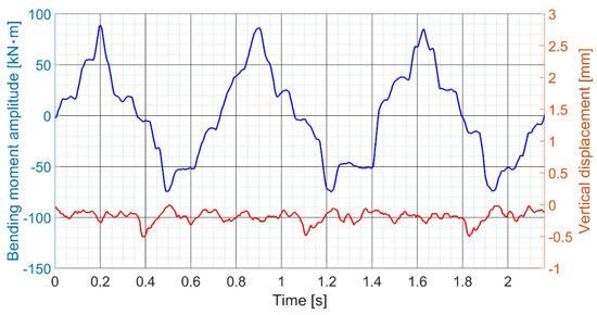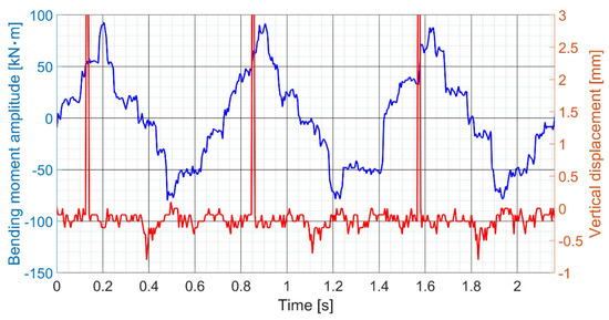 Example of a measured bending moment at the position of the strain gauge and the vertical displacement before processing at the NCR going straight ahead.
