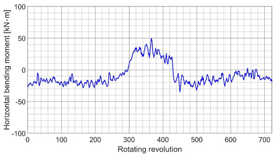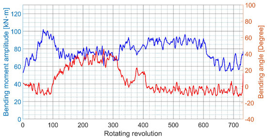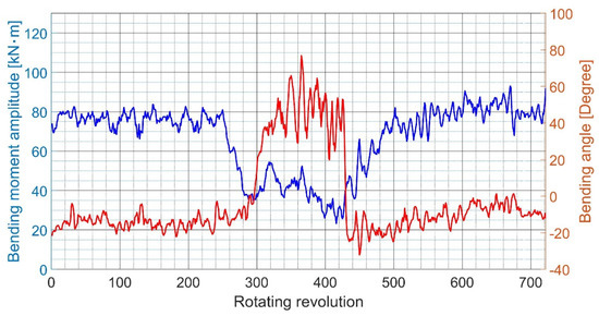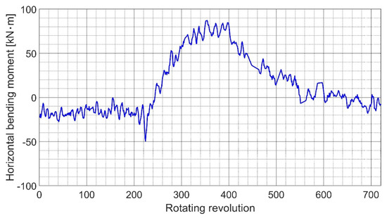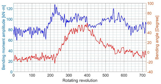 The above algorithm is very convenient and precise for a pure sine wave, or a wave that is close to a sine wave, such as in a static slow shaft turning test (using turning gear). The accuracy is sufficient in the case of a complex signal in a dynamic test. In fact, the signal waveform is the result of the summation of many separate sine waves. By using the fast Fourier transform (FFT), it is possible to distinguish the vibrations of separate orders. The magnitude of the bending moment, , and the bending angle, , are determined as the magnitude and the phase of the first-order vibration. In this way, the bending moment can be obtained for every revolution. Therefore, the bending moments of the separate vertical and horizontal components can be obtained using Equations (6) and (7), respectively. This process enables us to understand the general trends in the bending direction of the shaft.