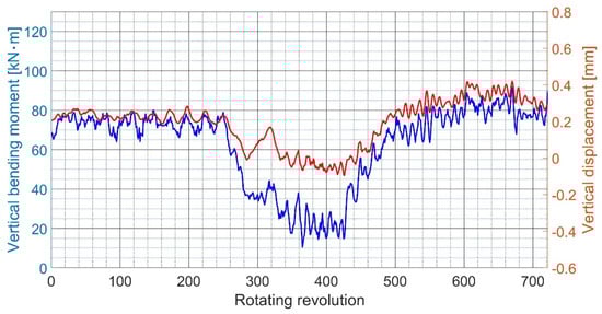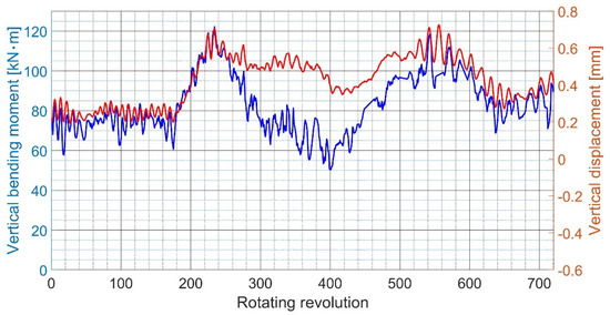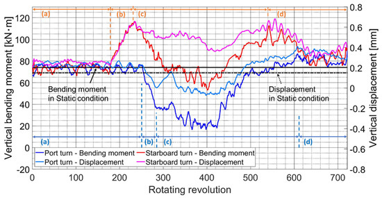 As described in Section 3.1, the straight solid line and the straight dotted line in Figure 23 represent the average value of the shaft’s bending moment and vertical displacement, respectively, obtained by rotating the shaft approximately one to two times using a turning gear. It can be observed that the shaft gradually rises as the eccentric propeller thrust gradually increases to the NCR.