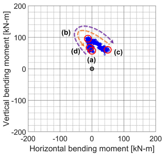 Using Equations (7) and (8), from the amplitude of the bending moment and the bending direction as shown in Figure 10, the vertical component of the bending moment was obtained as shown in Figure 11 in the comparison with the vertical displacement while the horizontal component is shown in Figure 12. In the same manner, the results of the rapid starboard turn test are depicted in Figure 13, Figure 14 and Figure 15.