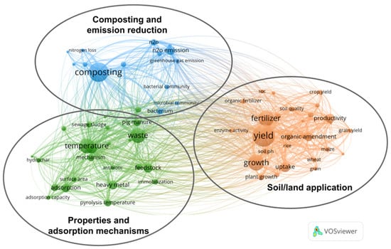 The figure, developed using VOSviewer tool, highlights the key themes of investigation in this area, i.e., (1) producing and characterizing biochar properties and adsorptive performance, (2) incorporating biochar as an emission mitigation aid in composting-related studies, and (3) biochar soil incorporation for crop production. The figure highlights the potential for integrative research to bridge the gap across these areas to assess the life-cycle performance of biochar in animal agriculture systems.