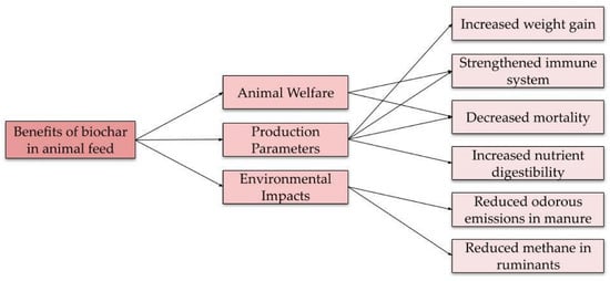 Animal nutrition has significant impacts on feed and growth efficiency as well as the properties of their excreted waste. Growers seek to maximize weight gain with the least amount of inputs and additives. The undigested macro and micronutrients pass into the manure and contribute to gaseous emission production. Approximately 60–85% of phosphorus, 70–80% of nitrogen, and 80–90% of potassium in animal feed are excreted as manure [70]. Biochar as a feed additive is not a new concept, and its chemical and physical properties have been hypothesized to reduce nitrogen content in excreta, decrease risk of pathogens, and strengthen the immune system of livestock and poultry among other benefits as shown in Figure 3 [71].