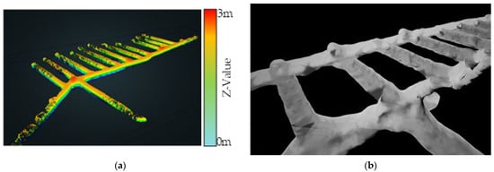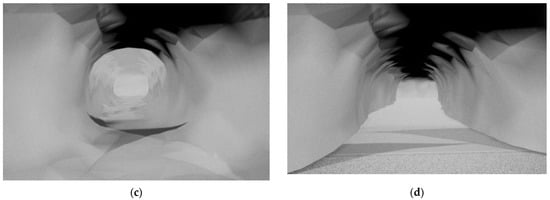 The original 3D tunnel model was constructed using a ZEB-Horizon 3D laser scanner developed by GeoSLAM, which scanned and reconstructed the data in a real tunnel. The reconstructed point cloud data after scanning is shown in Figure 1a; after it was imported into UE4, the tunnel model was saved in the assets in the format of a static mesh, as shown in Figure 1b. The internal state of the initial tunnel is shown in Figure 1c; it can be seen that the ground of the tunnel model is extremely rough, which is too different from the flat ground in an actual transportation tunnel, which is related to factors such as ponding in the tunnel and stacking of obstacles during data collection. Therefore, the floor of the tunnel ground was flattened in UE4, and the final tunnel is shown in Figure 1d.
