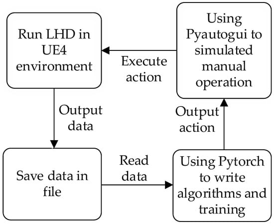 The underground simulation platform developed based on UE4 is an independent process and cannot directly interact with Python files using a third-party library. The reinforcement learning algorithms are based on Python’s Pytorch library. To realize the interaction between our algorithm and UE4 simulation components, UE4 is regarded as a black box, and Pyautoigui transmits operation instructions to the simulation platform, to realize the operation of the LHD machine, the current state information of the LHD machine is obtained, and saving through the SaveStringToFile function in UE4 C++ library. Other operations such as calculating reward functions and selecting action instructions are implemented in Python. The main flow of interactions is shown in Figure 3.