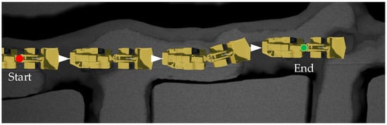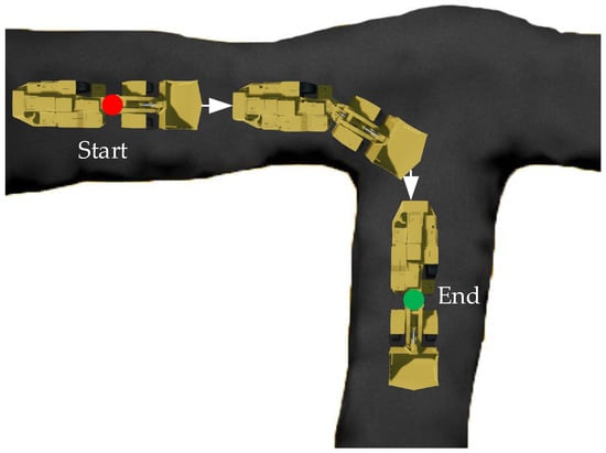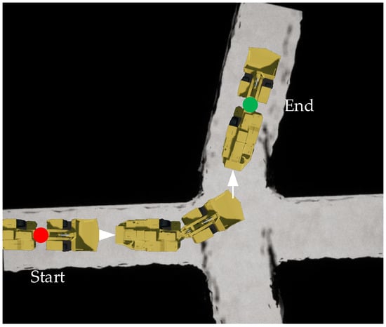 To further prove the good robustness of the TCB-DQN, the LHD machine was trained in a more complex tunnel, as shown in Figure 11. This condition meant that the LHD machine needed to travel a longer distance. If a reward is provided only when reaching the endpoint, the training process for the LHD machine would be extremely long. Therefore, a middle point was set on the way and add a distance from the middle reward point in the state space. At this time, the state spaces , , , , , and correspond to the speed , articulation angle of the LHD machine respectively , left side distance , right side distance , distance from middle reward point, and distance from final reward point. Set m, m, when and , it is considered to reach the stage reward point; when and , it is considered to reach the endpoint; the training rules are shown in Equation (10).