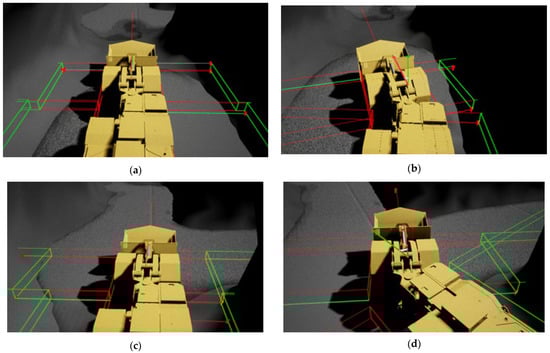 The monitoring condition of LHD machine walking in the tunnel. The green box indicates the detection range, the red line indicates the distance from the detection point to the scraper; (a) run in the straight tunnel, front radar status is false. Left and right radar status are true; (b) run in the straight tunnel, too close to the right; (c) run in the intersection, right radar status is false; (d) turn round, the radar status changes constantly.