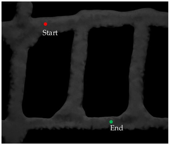 The optimal walking path of the LHD machine. The red point indicates the start location and the green point indicates the end location.