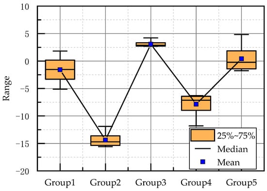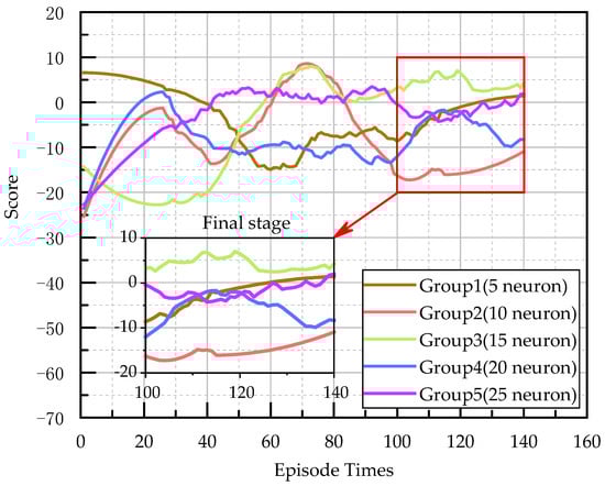 The training results are shown in Figure 12 and Table 4, and the results of 100–140 experiments are taken as the experimental scores of different neurons in the final stage. Figure 13 is the boxplot of the results of 100–140 experiments in each group. Group3 had the highest average score and the lowest standard deviation. This proved that Group3 scored significantly higher than the other groups in the final stage.